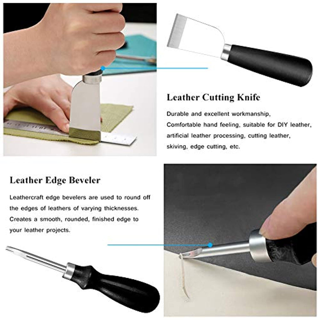 Herramientas de corte de cuero: recibirás 3 herramientas de cuero, incluyendo 2 bisagras de borde de cuero de diferentes tamaños y 1 cuchillo de corte de cuero, suficiente para que puedas usar y crear fácilmente bordes de cuero suaves y delicados.