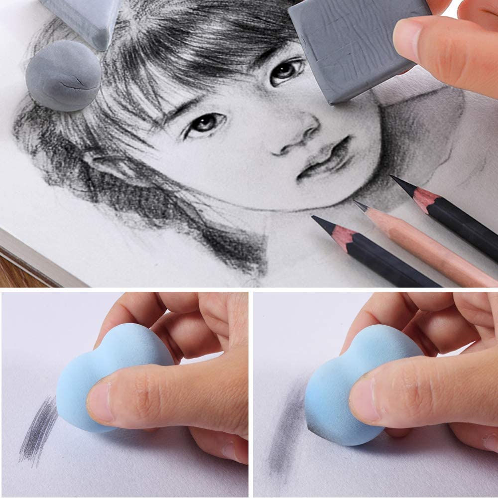 La goma amasada se puede moldear en cualquier forma, permanece superficies lisas y brillantes; la esponja de frotar crea sombras, línea de suavizado, efecto neblino; la herramienta de extensión de lápiz puede ayudarte a usar la mezcla de tocón y tortilliones más eficaz.