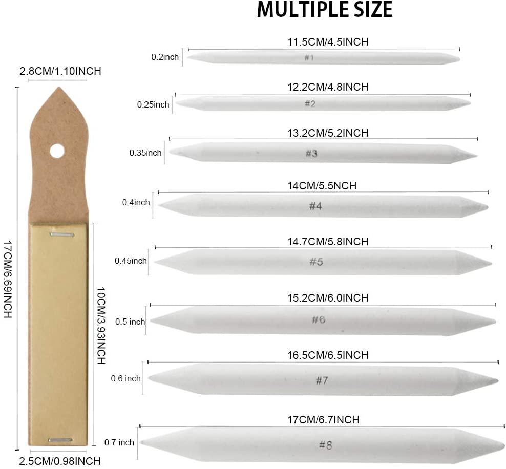 • Cantidad: el paquete incluye 8 piezas de difuminado (#1, #2, #3, #4, #5, #6, #7, #8), 3 piezas de batidoras de arte Tortillion (#1, #2, #3) y 1 puntero de papel de lija.