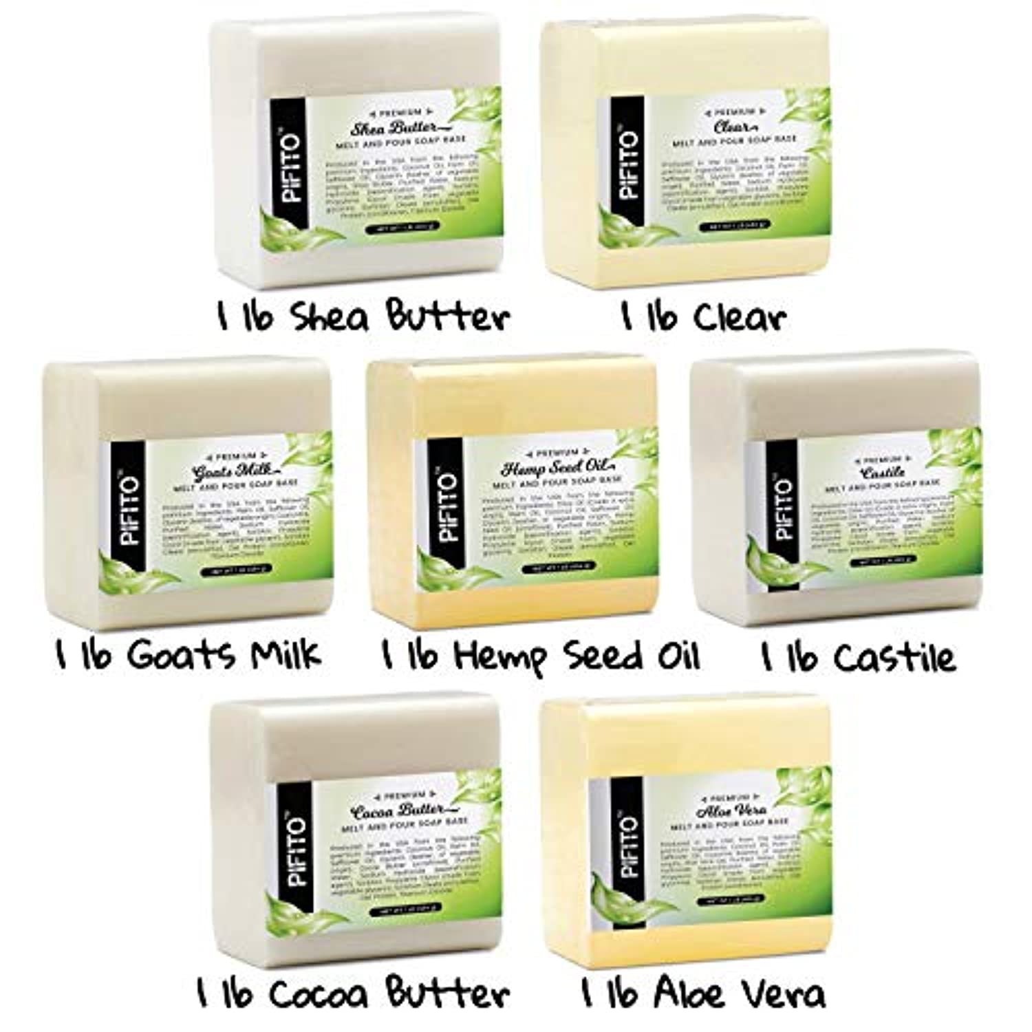 Inicio→Elaboración de Jabónes→Pifito Melt and Pour Soap Base Sampler (7 lbs) │ Surtido de 7 bases (1lb ea) │ Aceite de semilla de cáñamo, transparente, aloe vera, leche de cabras, manteca de cacao, manteca de karité, castilla │ Suministros de fabricación de jabón de glicerina