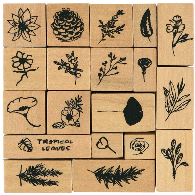 Variedad: 19 piezas diferentes de plantas y flores sellos de goma de madera.