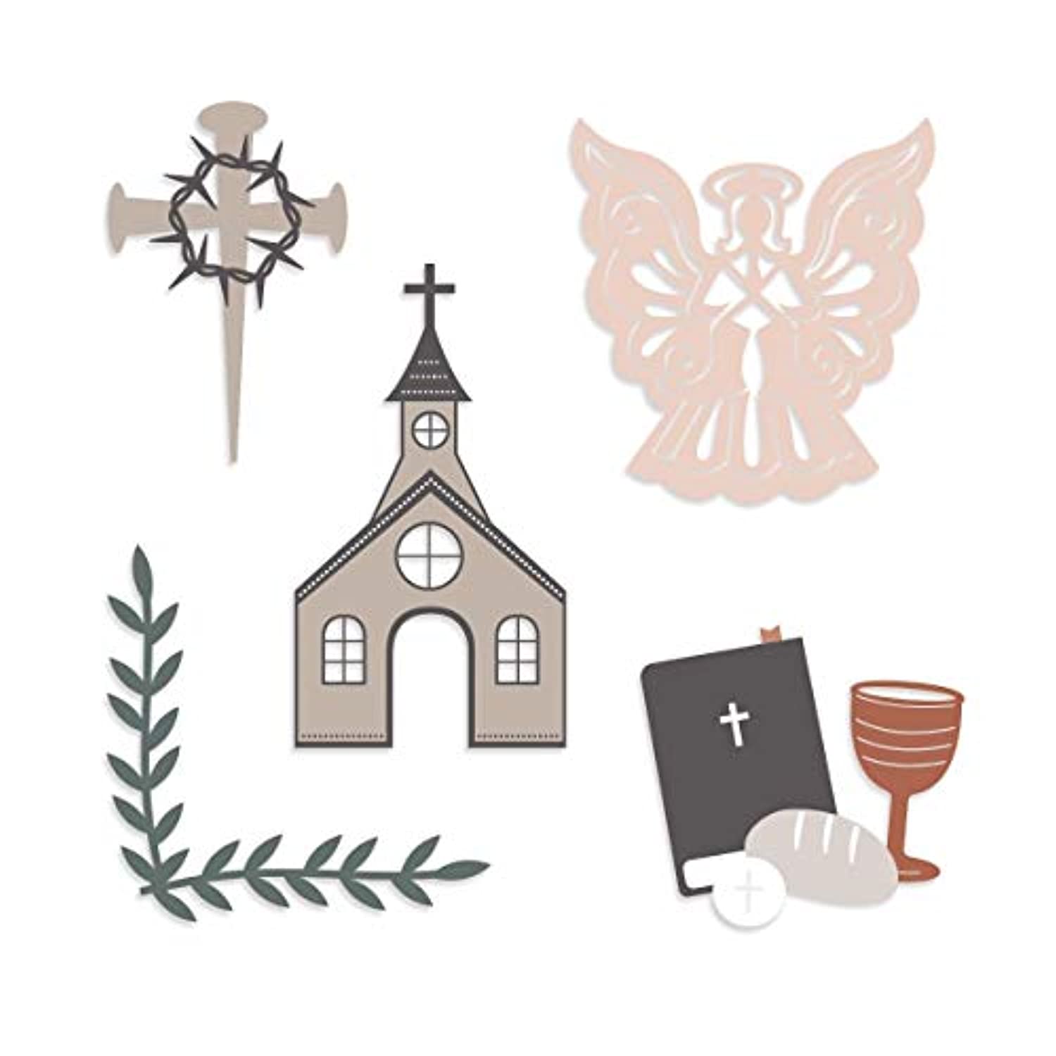 • Cuenta con iconos de temática religiosa como una iglesia, ángel, cruz con una corona de espinas, rama de oliva y elementos de comunión en capas con un libro sagrado