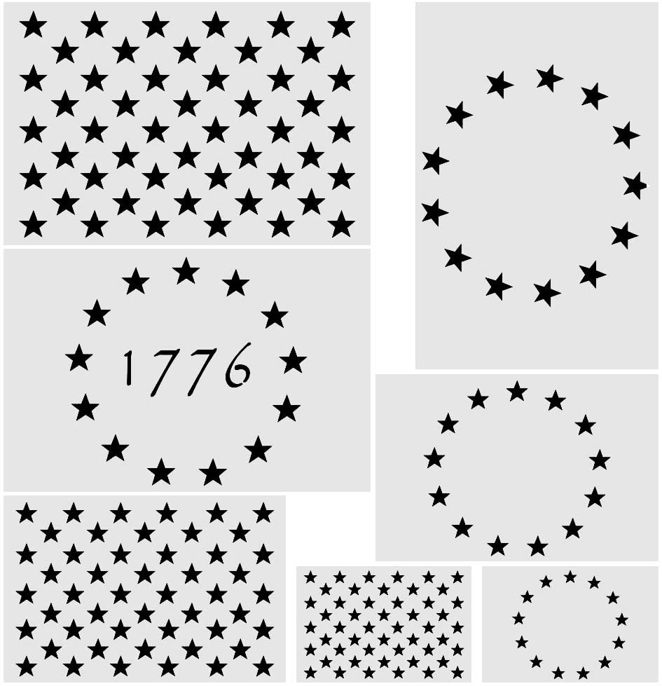 El paquete incluye: 7 plantillas con diferentes elementos americanos (con 3 hojas de plantilla de 50 estrellas en diferentes tamaños, 3 hojas de plantillas de 13 estrellas en diferentes tamaños, 1 hoja de plantilla 1776).