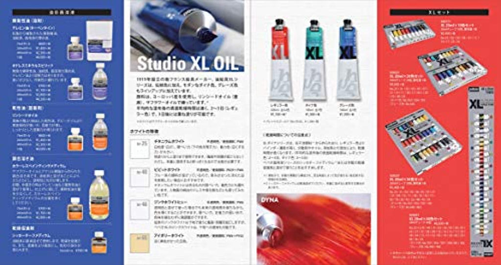 La gama incluye 64 colores, incluyendo 7 dyna y 5 esmaltes, que vienen en embalaje estándar, 37 ml, 80 ml y 200 ml, así como 5 colores en tarros de 650 ml; estudio XL fina de aceite colores se pueden mezclar juntos; La viscosidad es constante de un color a otro