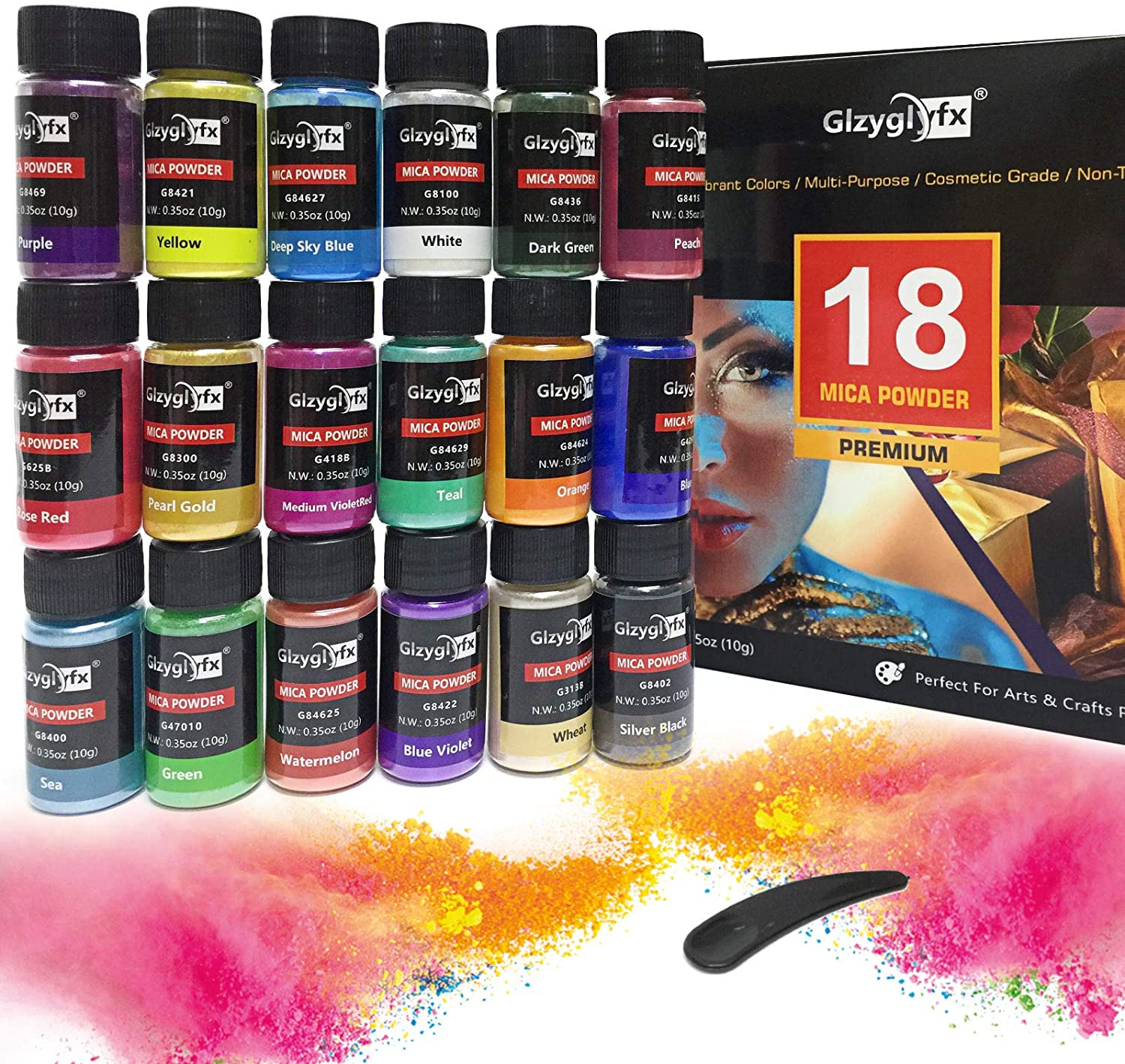 Polvo de pigmento: el pigmento de mica es un producto natural y orgánico, lleno de pigmentos vívidos y coloridos, funciona muy bien como un conjunto de polvo de pigmento para una variedad de aplicaciones de maquillaje, pintalabios, cosméticos y resina epoxi. Es un tinte seguro para askin