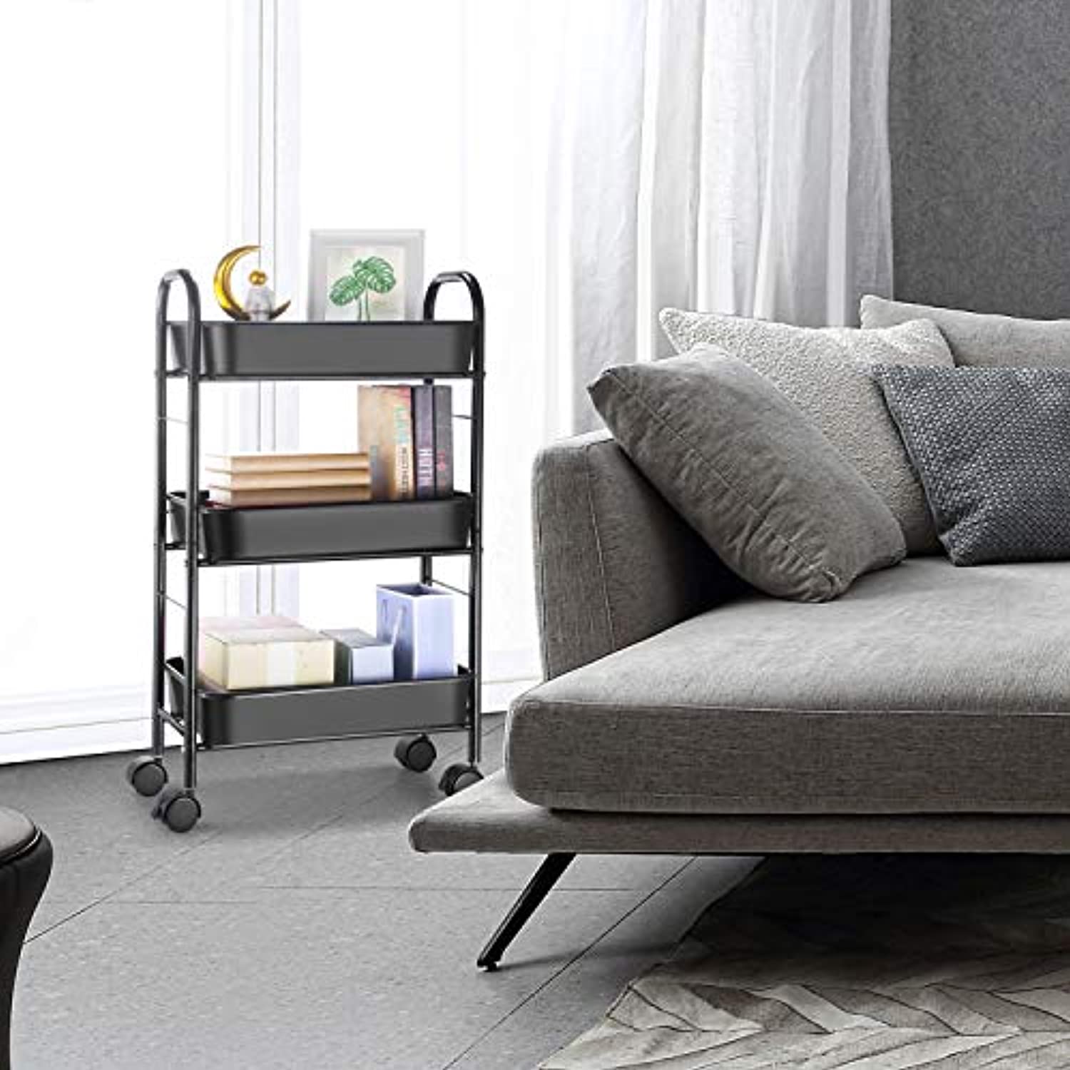 Simple Trending - Carrito de almacenamiento de 3 niveles de metal, organizador de utilidad con cesta de plástico en 2 ruedas bloqueables para baño de cocina, color negro