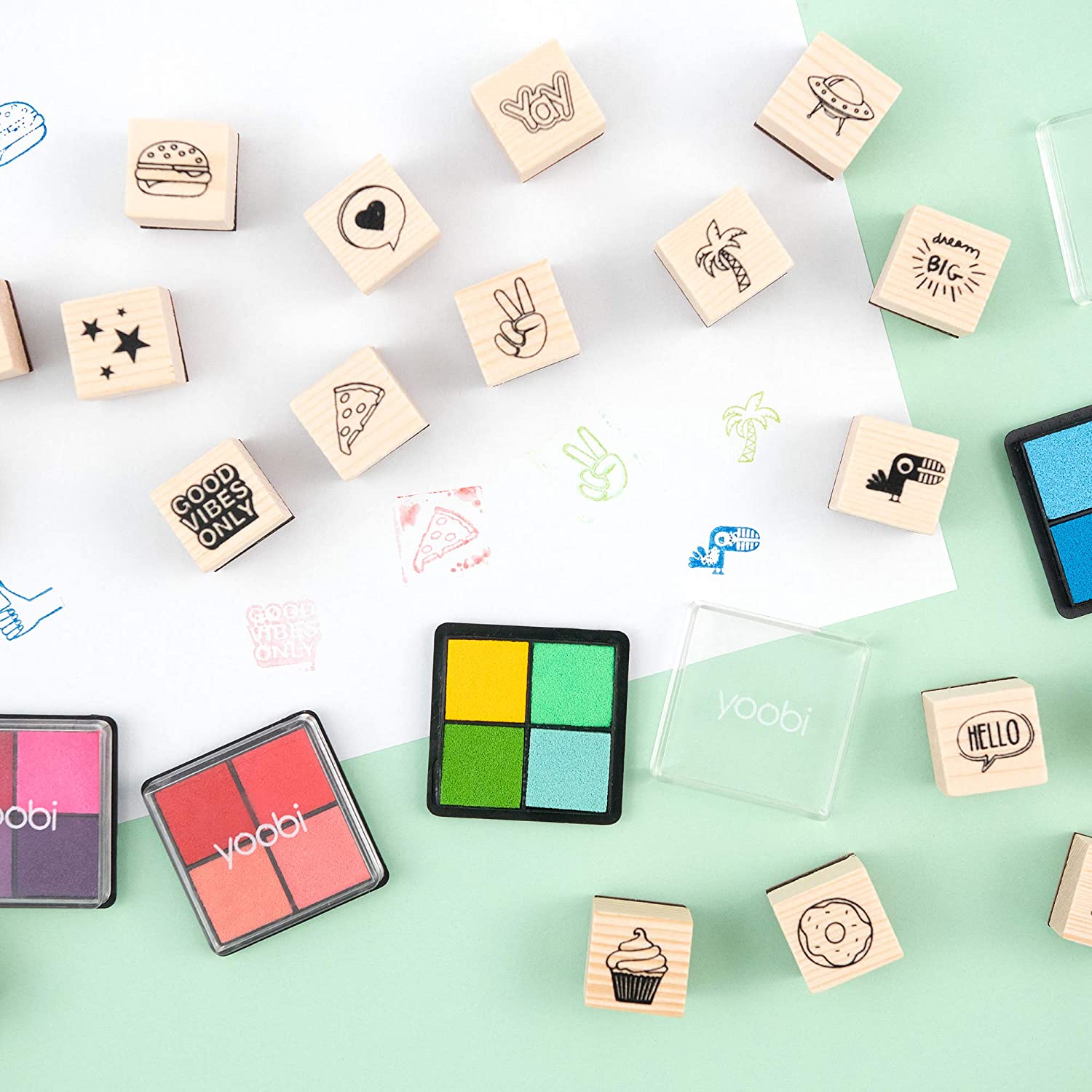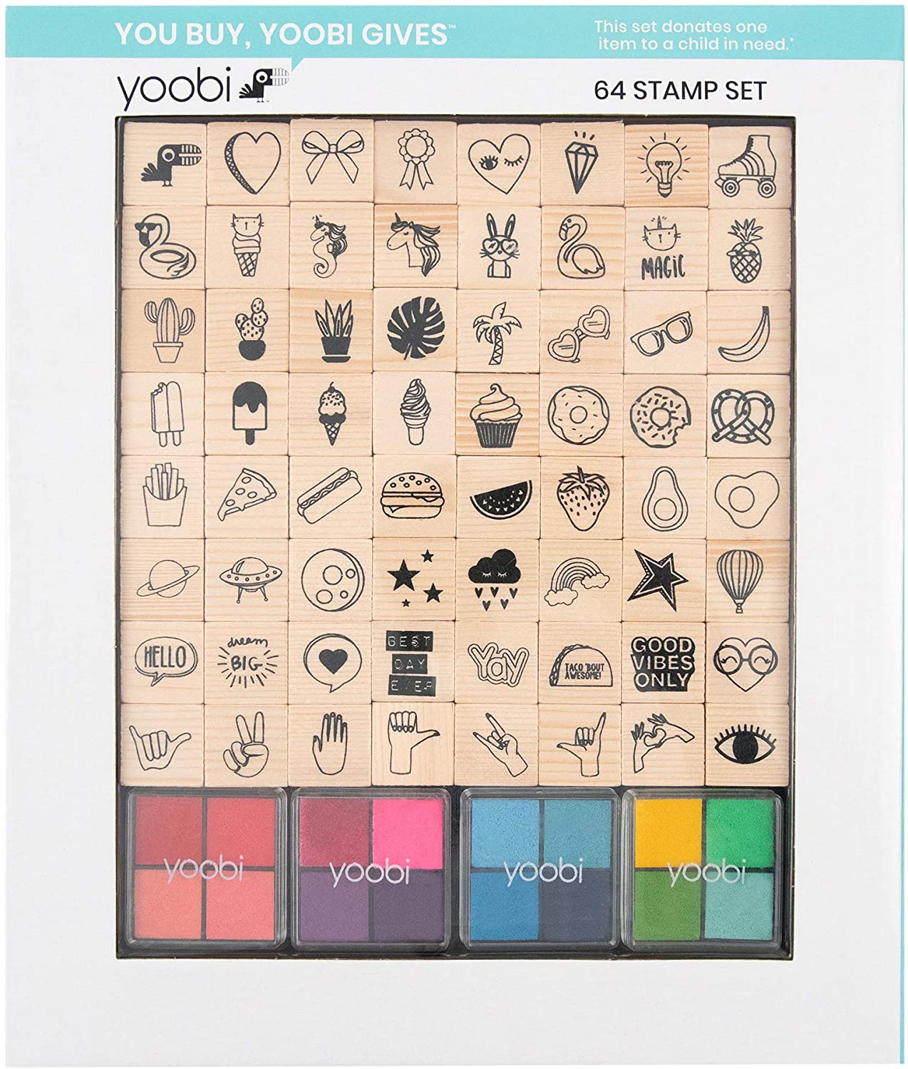 Yoobi - Juego de sellos (80 piezas, 64 sellos y 16 almohadillas de tinta de color), multicolor
